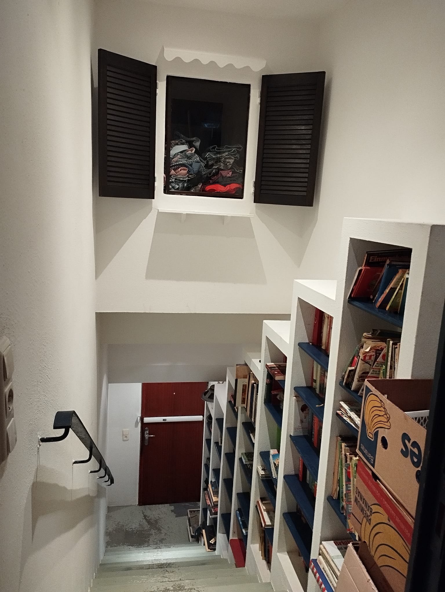 Der Flur ist im mediterranen Stil gehalten und verfügt über ein platzsparendes gemauertes Bücherregal in mehreren Ebenen mit Holzböden. Über der Treppe befindet sich eines der beiden zuvor genannten Ankleidezimmer mit einem Fenster mit Blick in den Flur/Diele.