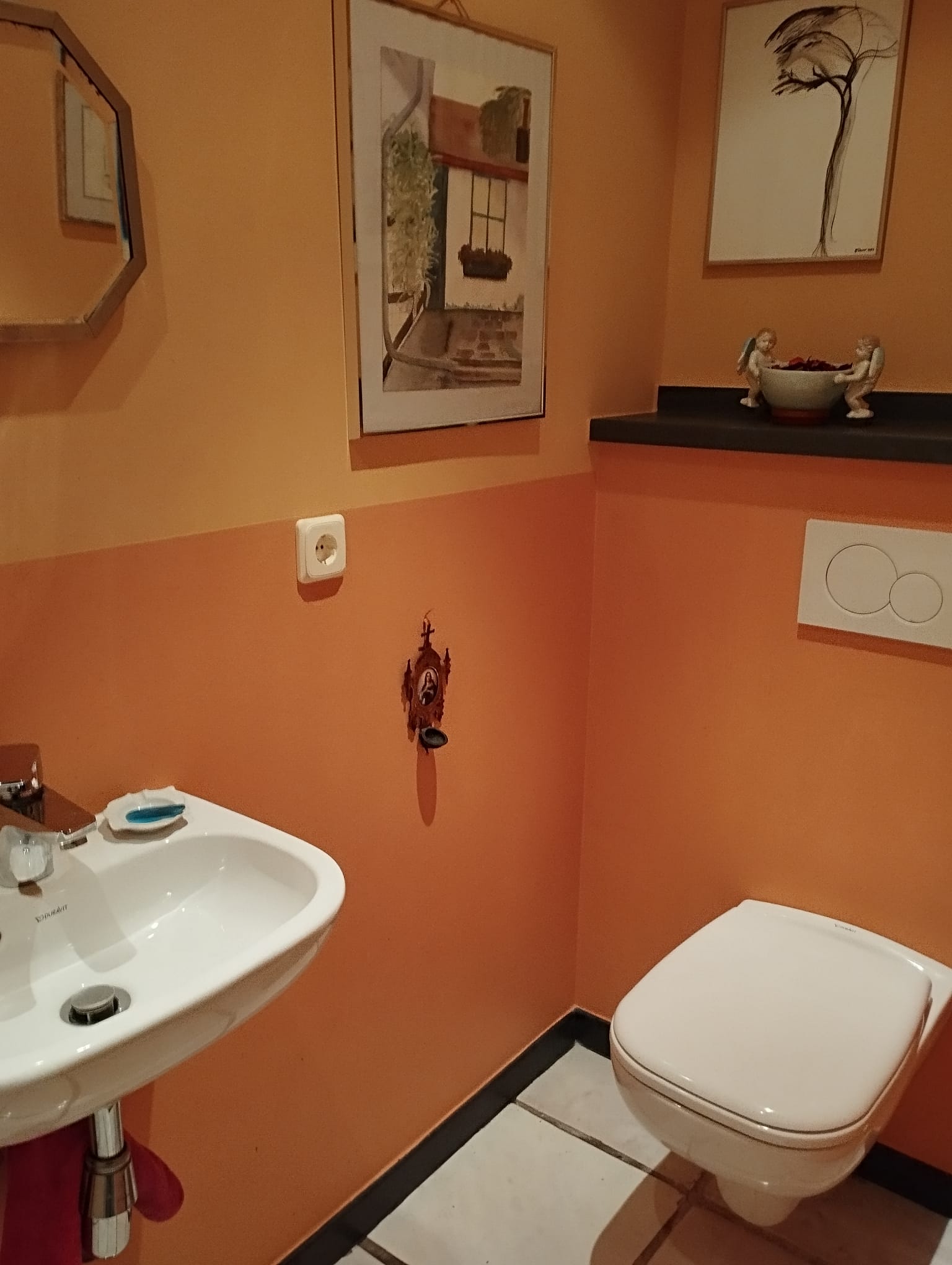 Die Gästetoilette steht dem Besuch zur Verfügung und befindet sich unmittelbar an der Verbindungstreppe zwischen oberer und unterer Wohnung, welche in Terracotta-Farben gehalten ist. In diesem Raum befindet sich ein Schrankwandregal für Putzmittel etc..